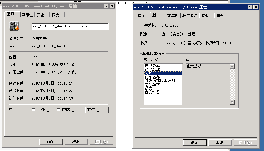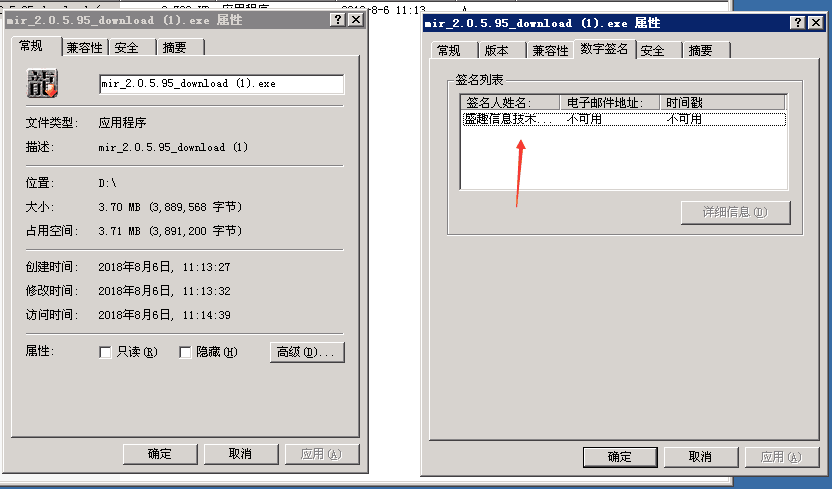 这边客户反馈他本地下载后上传到服务器上的文件就正常,这边将两个文件进行了对比,虽然两个exe文件大小相同,但是确缺少数字签名、版本等属性: